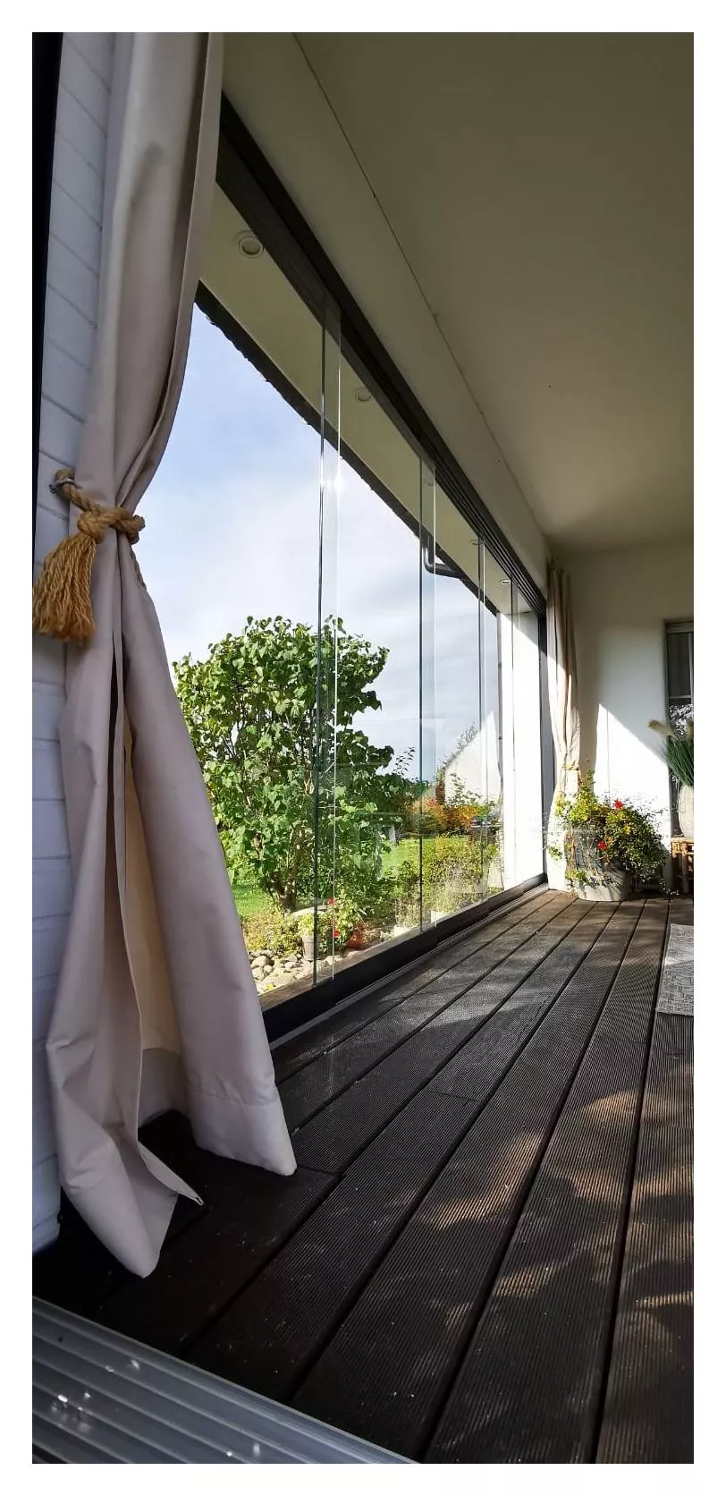 Uwaga: chcesz umieścić szklane drzwi przesuwne na werandzie o głębokości 3 lub 4 metrów? W takim przypadku należy pamiętać, że systemy szyn nie pasują dokładnie do tych standardowych głębokości. Możesz wówczas albo wypełnić przestrzeń słupkiem od strony ściany, albo zamontować dłuższy system szyn, sprawiając w ten sposób, że panele szklane będą na siebie bardziej zachodziły.
