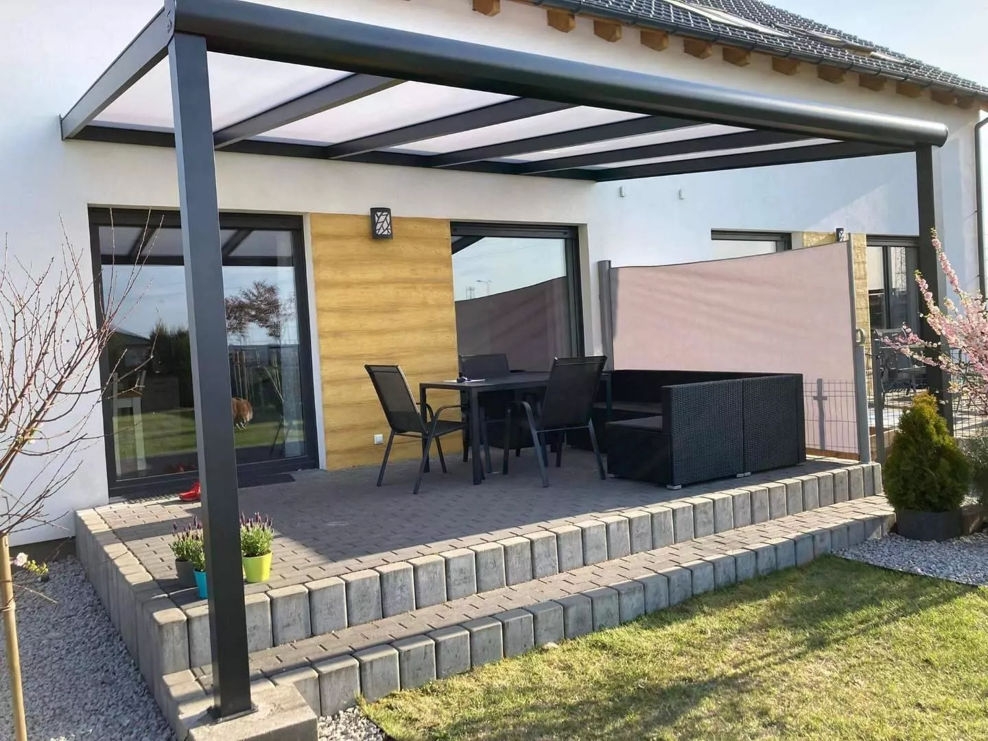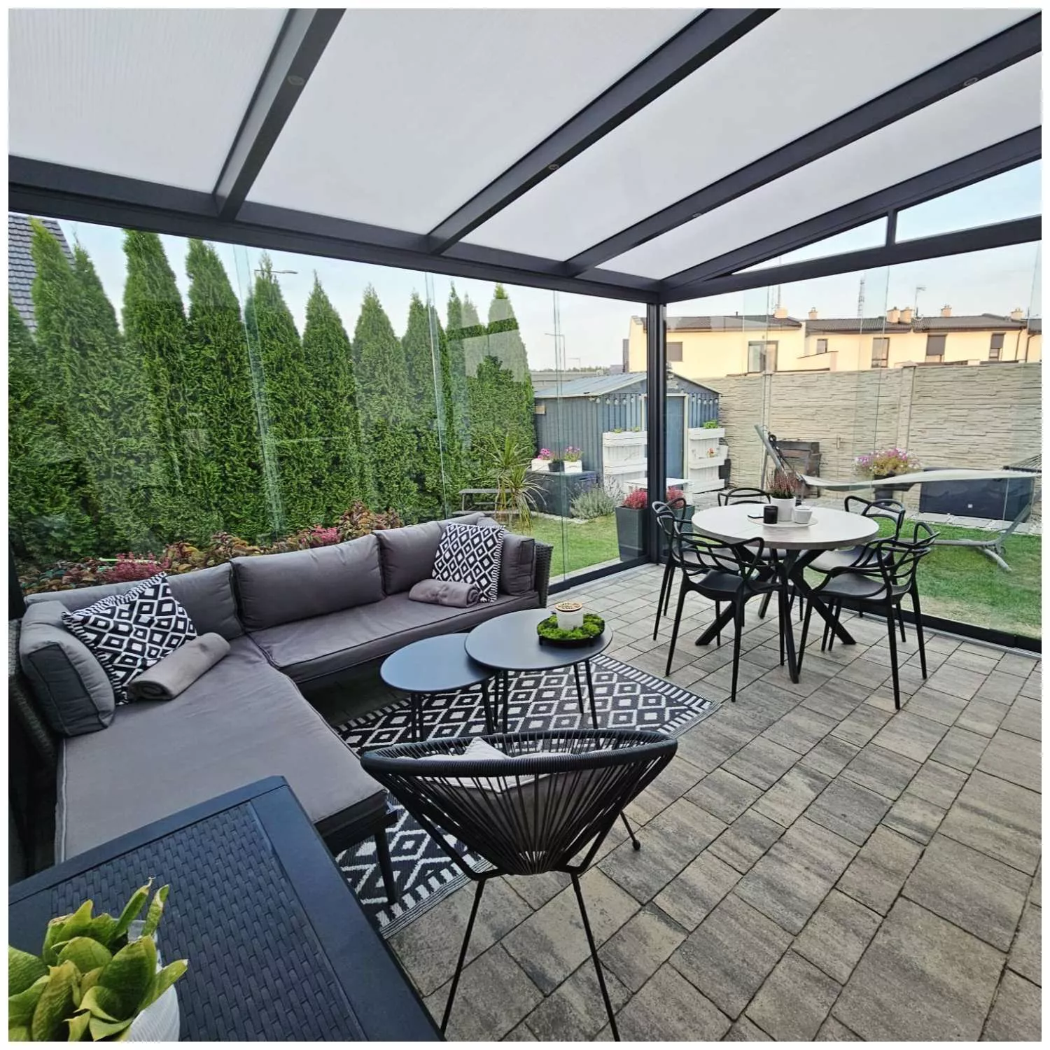 - Głębokość: Standardowe głębokości to 2,50 m, 3,00 m, 3,50 m i 4,00 m. W przypadku dachów z poliwęglanu można przyciąć głębokość. Uwaga – skrócenie głębokości uniemożliwia zamontowanie bocznych szklanych ścian.